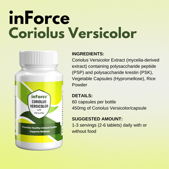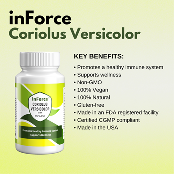 inForce is a dietary supplement made up of Coriolus Versicolor to help support the body's immune system. It is a proprietary blend and offers the best value for the money. It is a combination of both Polysaccharide-K (PSK) and Polysaccharide Peptide (PSP). inForce offers much needed immune support and it can be taken on a daily basis. This product is 100% vegan and bottled in the United States in a FDA registered bottling facility that is CGMP compliant (Current Good Manufacturing Practices).